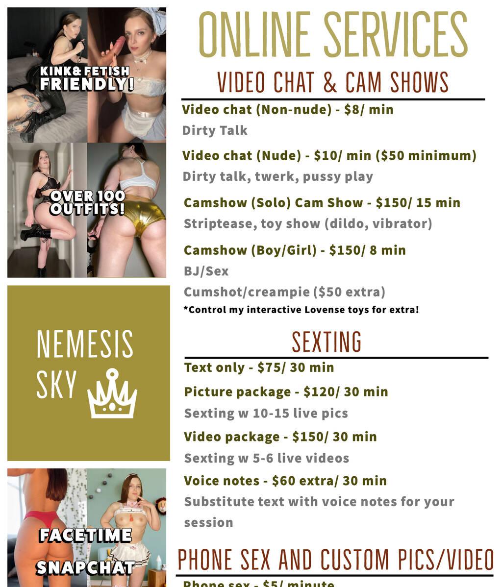 ***ONLINE ONLY*** Hey guys! My name is Nemesis Sky. I am an escort, dominatrix and pornstar based in Vancouver (If you are reading this ad, I am not in your town). However, I am always available for online fun ;) I offer: -Phone sex: $5/ min -Sexting: $75/ half hour -Custom pictures: $75/ 5-10+ custom pics -Cam shows: $150/ 15 min ($150/ 8 min for show with male duo partner (bj,s*x) -Control my lovense interactive sex toy $50/15 min. Can be added on to any service, make me cum!! -Custom videos: inquire for rates You can check out my FREE trailers and teases on twitter https://twitter.com/NemesisSky2 and pornhub https://www.pornhub.com/model/nemesissky69 All full length content is unlocked on my OnlyFans for $20 a month! https://onlyfans.com/nemesis_sky I accept amazon.ca GC or etransfer. For tour dates, make sure to follow me on twitter and my website www.nemesissky.com where it will be announced! Text me to set up some dirty online fun ;) 778 628 2883
